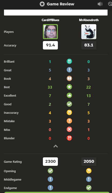 On the 11th October 2025, I played in the 90 30 Online Swiss that i mentioned below on the 8th September -it was round 3 and i found out my opponent couldnt play in a similar 45 45 online swiss for this round so we agreed an off board draw. In the same 45 45 swiss I cannot make the next round as i am going to play in the otb 4NCL(national) League in dudley on the weekend of the 17th to 19th of October, i am playing as board 6(of 6) for The Full Ponty team(in Division 4), on the 21st October I play for the 4NCL online League for Malpas and Friends on board 2 of 4 also in Division 4 and i go down to london to play in the golders green rapidplay on the 8th November 2025 On the 7th October 2025, I played in the 4NCL Online League Season 12 round 3, for the team Malpas and Friends against the team Wessex G, on board 1 of 4 boards, the time control was 45 mins with 15 second increment after every move, i lost being outplayed by a 14 yo in the endgame and the team lost 2.5-1.5. The game is below:- On the 28th September 2025, I played in the Chess.com world club arena for the Malpas and friends team i finished 87th out of 269 players and the team finished 11th. i got 3 wins 2 draws and 2 loses. On the 27th September 2025, I played the 2nd round game in my chess trainers(Chien Mings) 90 30 swiss online on chess.com, it was spectacular and the annotated game is given a bit further below on the 8th September comments. On the 23rd September 2025, I played in the 4NCL Online League Season 12 round 2, for the team Malpas and Friends against the team Worcester Wolfpack C on board 3 of 4 boards, the time control was 45 mins with 15 second increment after every move, i drew and the team won 3.5-0.5 to leave us 5th in division 4. The game is below:- In the third and final Global Chess League on the 21st September 2025, I finished in 28th place with 43 points out of 268 players. A game played online, I am white and win quickly. On the 14th September 2025, I finished 41st out of 161 in the Global Chess League second arena. I got 29 points. On the 13th September 2025, I came 31st out of 280 in the Global Chess League first arena of three. I got 47 points. Hello folks, I am going to have a busy time of it mainly online in the coming weeks, my itennary for before Christmas, is today 13th the 14th and the 21st September are Global Chess League days when I compete probably unsuccessfully in an online series of 5 0 3 hour arenas. every week or so I'll be playing in Chien Mings online tournaments as stated below, and on the 23rd September I will be playing the first of a number of games for the Malpas and Friends 4NCL(ie national) League online. In October 18th and 19th I will be playing in my next otb event, a national(4NCL) otb League match in dudley, playing for 'The Full Ponty' team. In November 9th I will be in London playing in the Golders Green Tournament in the rapidplay open section. On the 8th September 2025 a tournament (set up by my trainer fhunfi) starts of 90 30 there are over 40 competitors it will be played online my first game is against a handle called 'condor34(1173)', the games will be below and further down will be the 45 45 tournament games Games displayed- Game 1 win Game 2 win Game 3 loss Game 4 win Game 5 win Game 6 loss My first game in the 45 45 online chess.com tourney run by my trainer fhunfi is to be played vs 'JohnnyErasmic(1144)'' as Black on the 4th September 2025, that game and the rest will be below this paragraph Games displayed-addition-I have pulled out of this tournament due to commitments and the rather erratic pairing, I am still in the 90 30 trainer tourney Game 1 0.5 Game 2 bye(0pt) Game 3 bye(0.5pt) Game 4 bye(0pt) Game 5 Game 6 1st September 2025- I start an online tournament set up by my trainer its classical time control and I will play the games on my smartboard. Games are 1 every 2 weeks and another tournament online starts in a week of 90 30 tc chess. On the weekend of the 15th to 17th of August 2025, I played in the Lancaster Intermediate and got 2 points out of 5- 1 win, 2 draws, 2 loses. The games are below:- Games displayed- Game 1 Game 2 Game 3 Game 4 Game 5 Tomorrow on the 15th August 2025, i am going to Lancaster to play in the Intermediate section of their classical time control tournament. Currently i am the 6th seed out of 37 players. details will be placed on this page. I went back to the Barrow Chess Club for a meet on the 21st July 2025, here are three 10 minute friendlies i played, I won all three- click on the game number for the video: ---Game 1 --- Game 2 --- Game 3--- In a months time I am going to the Lancaster Congress entering the intermediate section. (Above)This was the position from game 3 of the South Wales International, I am Black against Nigel Moyes and play 17...Bxa2 is this a mistake?? Answer below:- click here