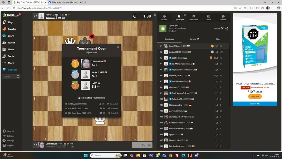 On the 20th December 2025, I played in a series of 4 Online Blitz Tournaments of 3 2 time control in the Isle of Wight Christmas Blitz. In the first two I got 3.5/9 in both and in the last 2 tournaments I got 4/9 totalling 15/36 points and finishing around 30th out of around 50 strong players each round but my overal result was an amazing 11th out of 93 and can be seen here.
